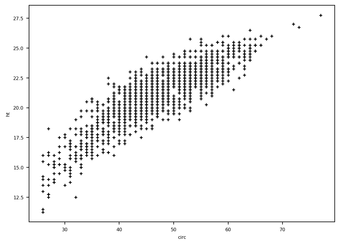 plt.plot(eucalyptus.circ, eucalyptus.ht, 'ht') ; plt.xlabel('circ')