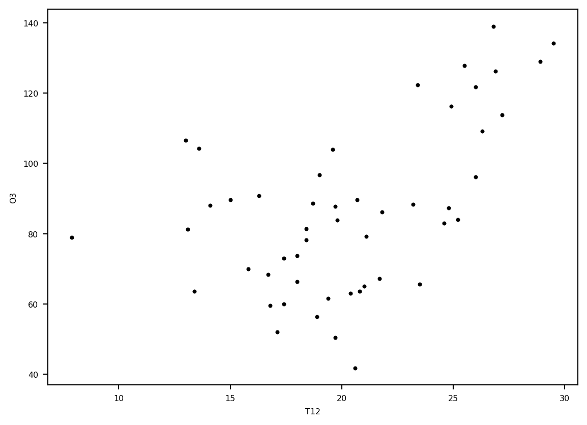 plt.plot(ozone.T12, ozone.O3, 'O3') ; plt.xlabel('T12')