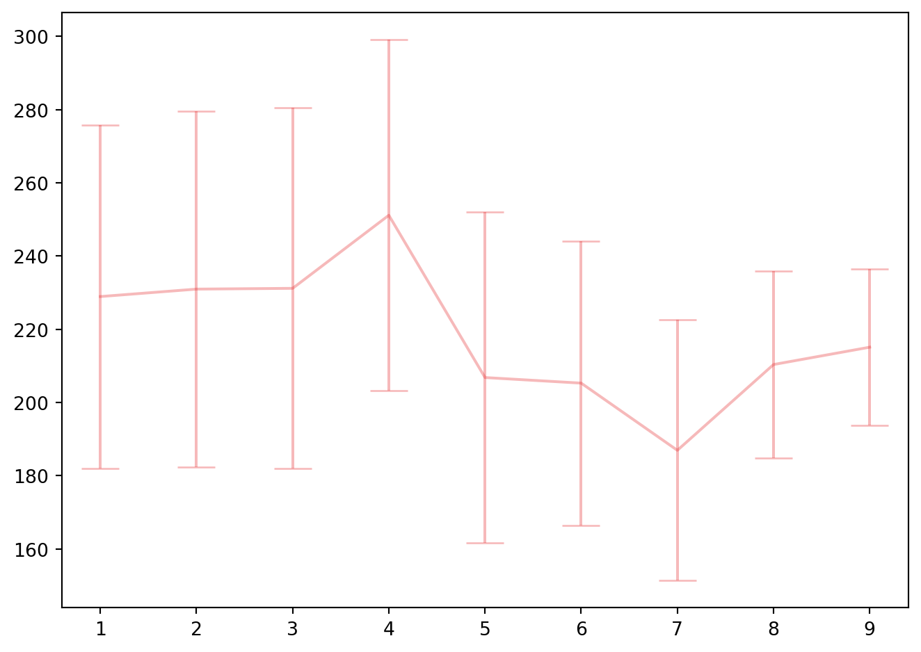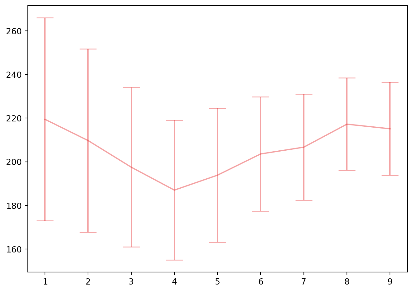 fig, ax1 list(range(1,10)), -cv_pls.cv_results_["mean_test_score"], cv_pls.cv_results_["std_test_score"]/kf.n_splits**0.5 , capsize=10, c=colors[0], ecolor=colors2[0])