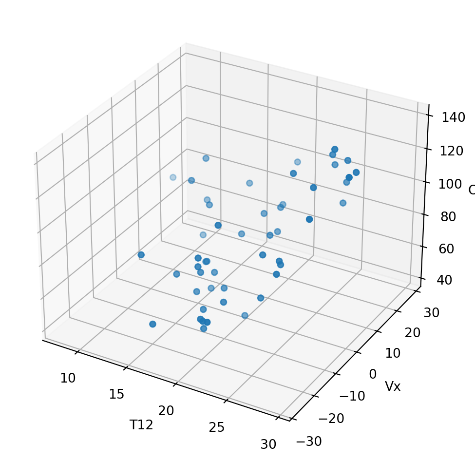 ax.scatter(ozone.T12, ozone.Vx,ozone.O3)'T12') ; ax.set_ylabel('Vx') ; ax.set_zlabel('O3')