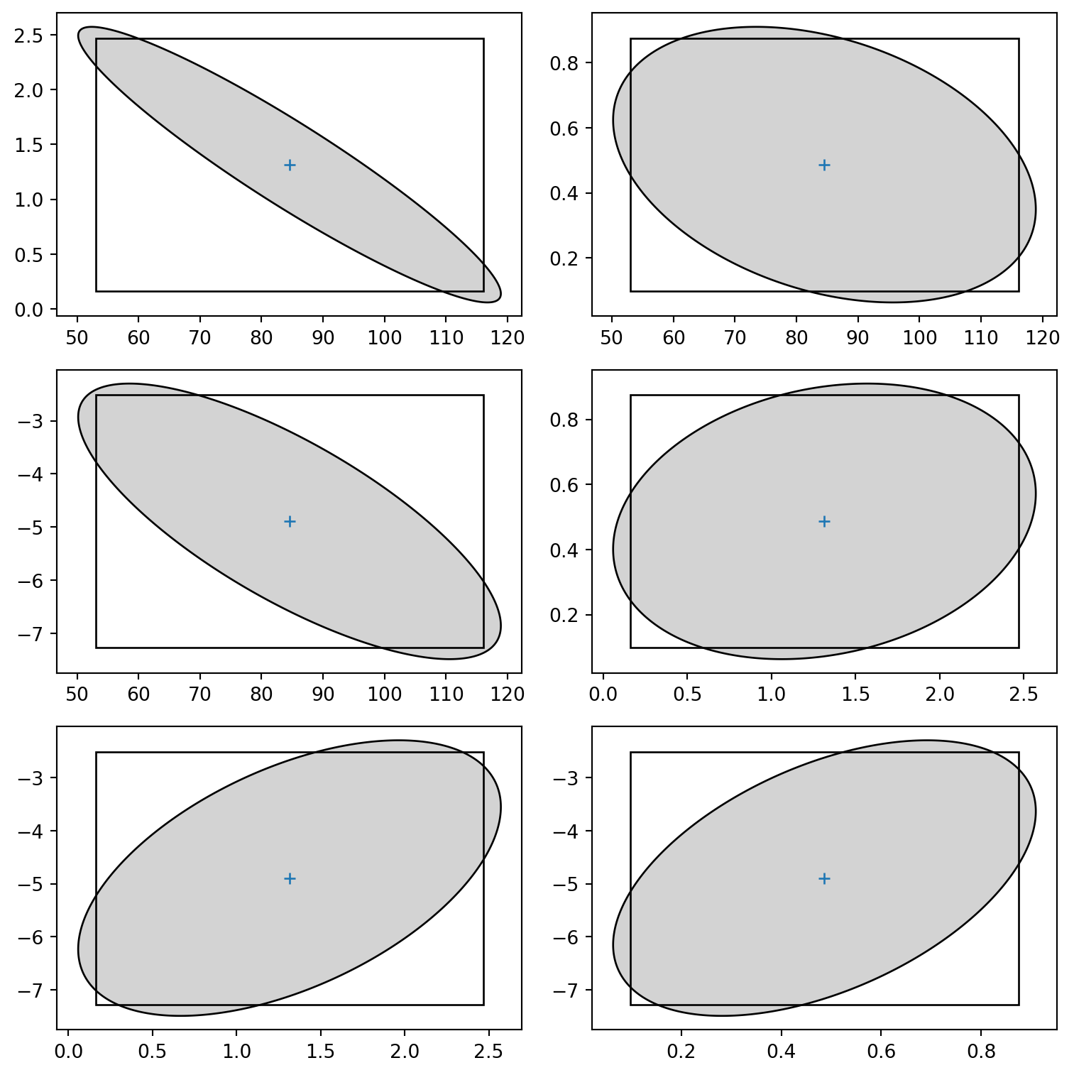 axs[il,ic].plot(mod3.params.iloc[i], mod3.params.iloc[j], = matplotlib.patches.Rectangle(ICparams.iloc[[i, j], 0], ICparams.diff(axis=1).iloc[i, 1], ICparams.diff(axis=1).iloc[j, 1], fill=False)