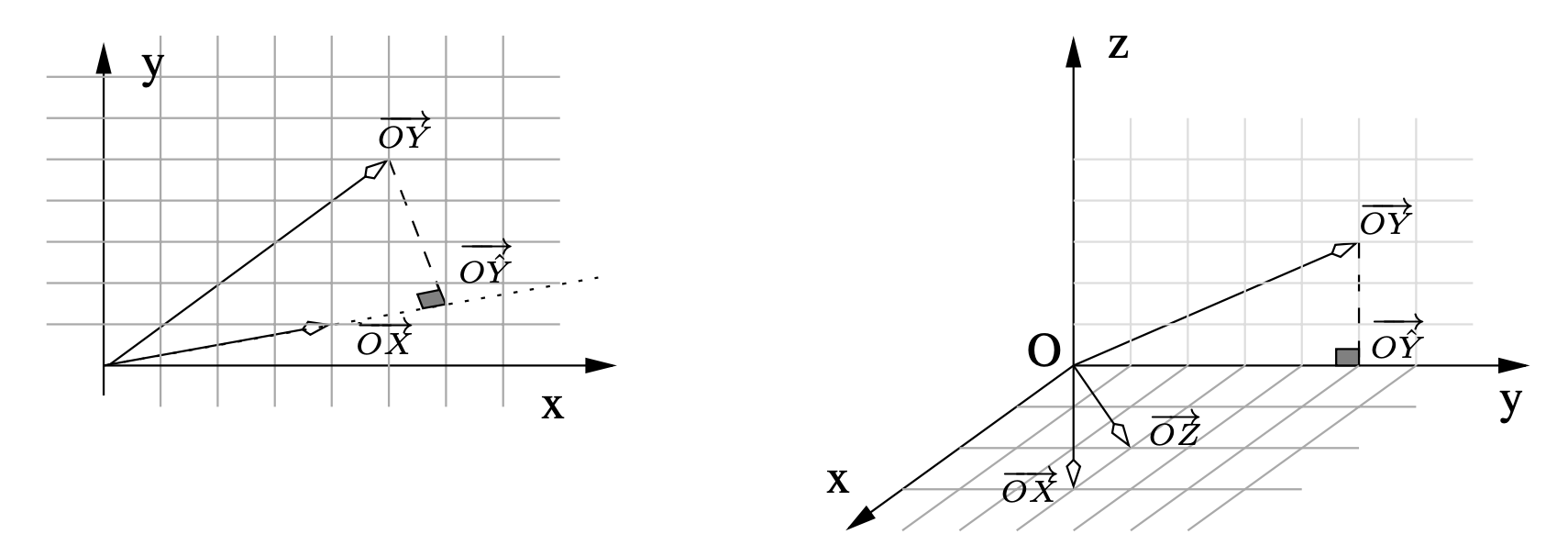 Considérons \(\mathbb R^3\) muni de la base orthonormée \((\vec{i},\vec{j},\vec{k})\). Les vecteurs \(\overrightarrow{OX}\) et \(\overrightarrow{OZ}\) engendrent le même plan que celui engendré par \((\vec{i},\vec{j})\). La projection de \(Y\) sur ce plan donne \(\overrightarrow{O \hat Y}\). Il est quasiment impossible de trouver \(\hat \beta\) et \(\hat \gamma\) graphiquement mais nous trouvons par le calcul \(\hat \beta = -3.33\) et \(\hat \gamma =5\).