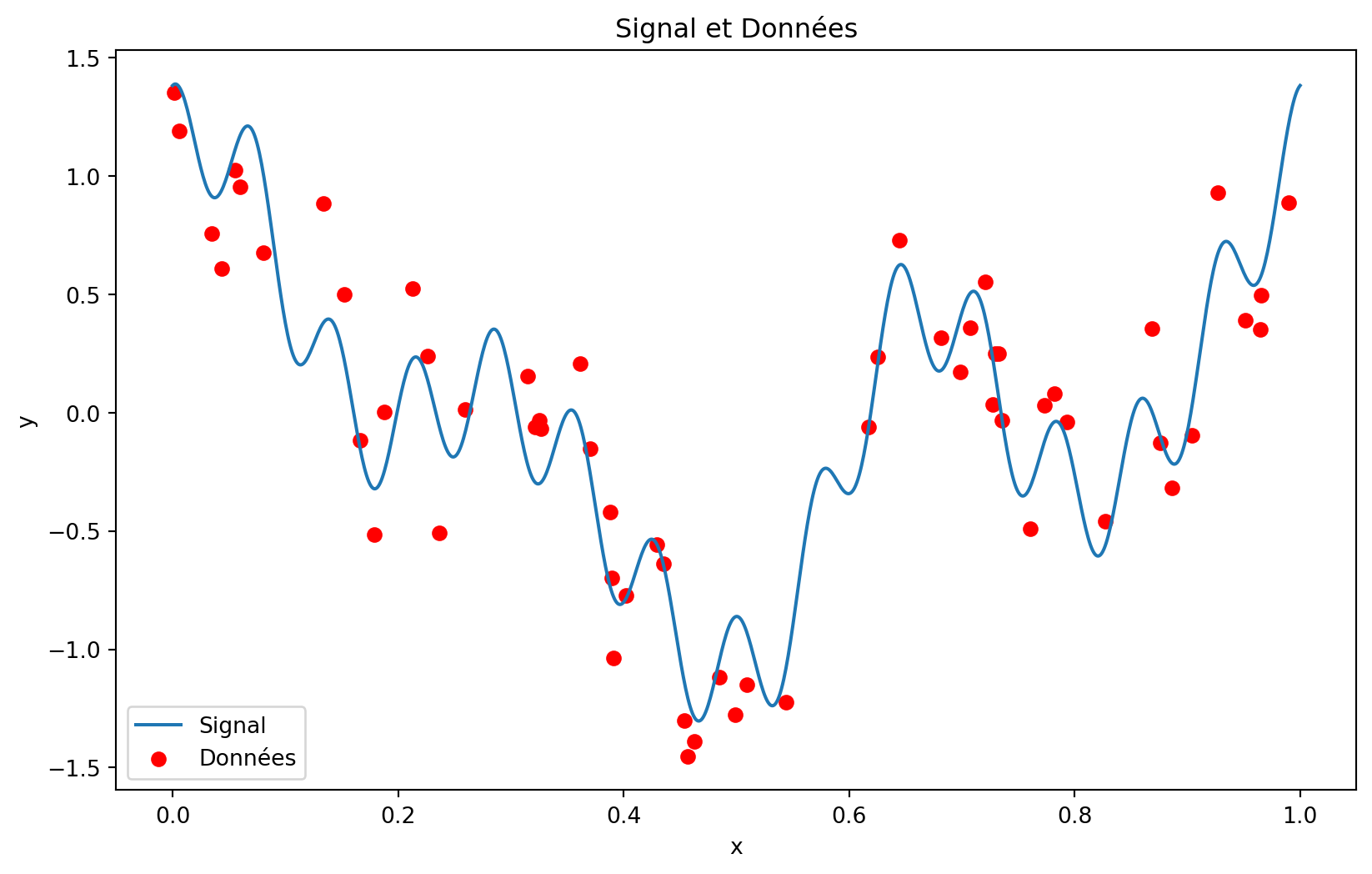 représentée par une collection de fonctions \(\{\psi_j(x)\}_{j=1,\dots,K}\) et de décomposer le signal dans cette base : \[ m(x)\approx \sum_{j=1}^K \beta_j\psi_j(x). \] Pour un dictionnaire donné, on peut alors considérer un modèle linéaire \[ y_i=\sum_{j=1}^K \beta_j\psi_j(x_i)+\varepsilon_i. \tag{1}\] Le problème est toujours d’estimer les paramètres \(\beta_j\) mais les variables sont maintenant définies par les éléments du dictionnaire. Il existe différents types de dictionnaire, dans cet exercice nous proposons de considérer la base de Fourier définie par \[ \psi_0(x)=1,\quad \psi_{2j-1}(x)=\cos(2j\pi x)\quad\text{et}\quad \psi_{2j}(x)=\sin(2j\pi x),\quad j=1,\dots,K. \]def mat_dict(K, x): # Initialiser une matrice de zéros avec la taille appropriée = np.zeros((len(x), 2 * K)) res # Remplir la matrice avec les valeurs cos et sin for j in range(1, K + 1): 2 * j - 2] = np.cos(2 * j * np.pi * x) res[:, 2 * j - 1] = np.sin(2 * j * np.pi * x) res[:, # Convertir la matrice en DataFrame pour un usage similaire à tibble = pd.DataFrame(res) res_df return res_df