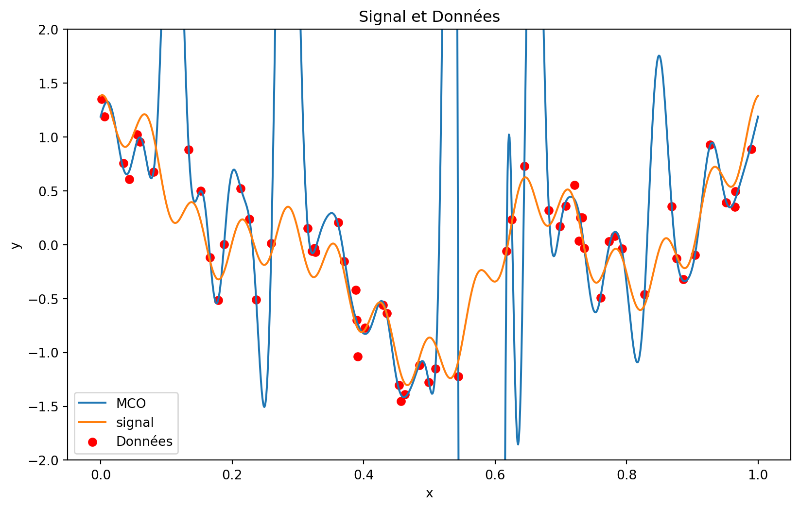 # Créer le dictionnaire pour les données = mat_dict(25, donnees['X']) D25 'Y'] = donnees['Y'] D25[ # Ajuster le modèle linéaire = sm.add_constant(D25.drop(columns='Y')) X = D25['Y'] y = sm.OLS(y, X).fit() mod_lin # Créer le dictionnaire pour le signal = mat_dict(25, signal['x']) S25 # Faire des prédictions = sm.add_constant(S25) S25 = mod_lin.predict(S25) prev_MCO # Préparer les données pour le tracé = signal.copy() signal1 'MCO'] = prev_MCO signal1[= signal1.rename(columns={'y': 'signal'}) signal1 = signal1.melt(id_vars=['x'], value_vars=['signal', 'MCO'], var_name='meth', value_name='y') signal2 # Tracer les résultats =(10, 6)) plt.figure(figsizefor key, grp in signal2.groupby('meth'): 'x'], grp['y'], label=key) plt.plot(grp['X'], donnees['Y'], color='red', label='Données') plt.scatter(donnees[-2, 2) plt.ylim('x') plt.xlabel('y') plt.ylabel( plt.legend()'Signal et Données') plt.title( plt.show()