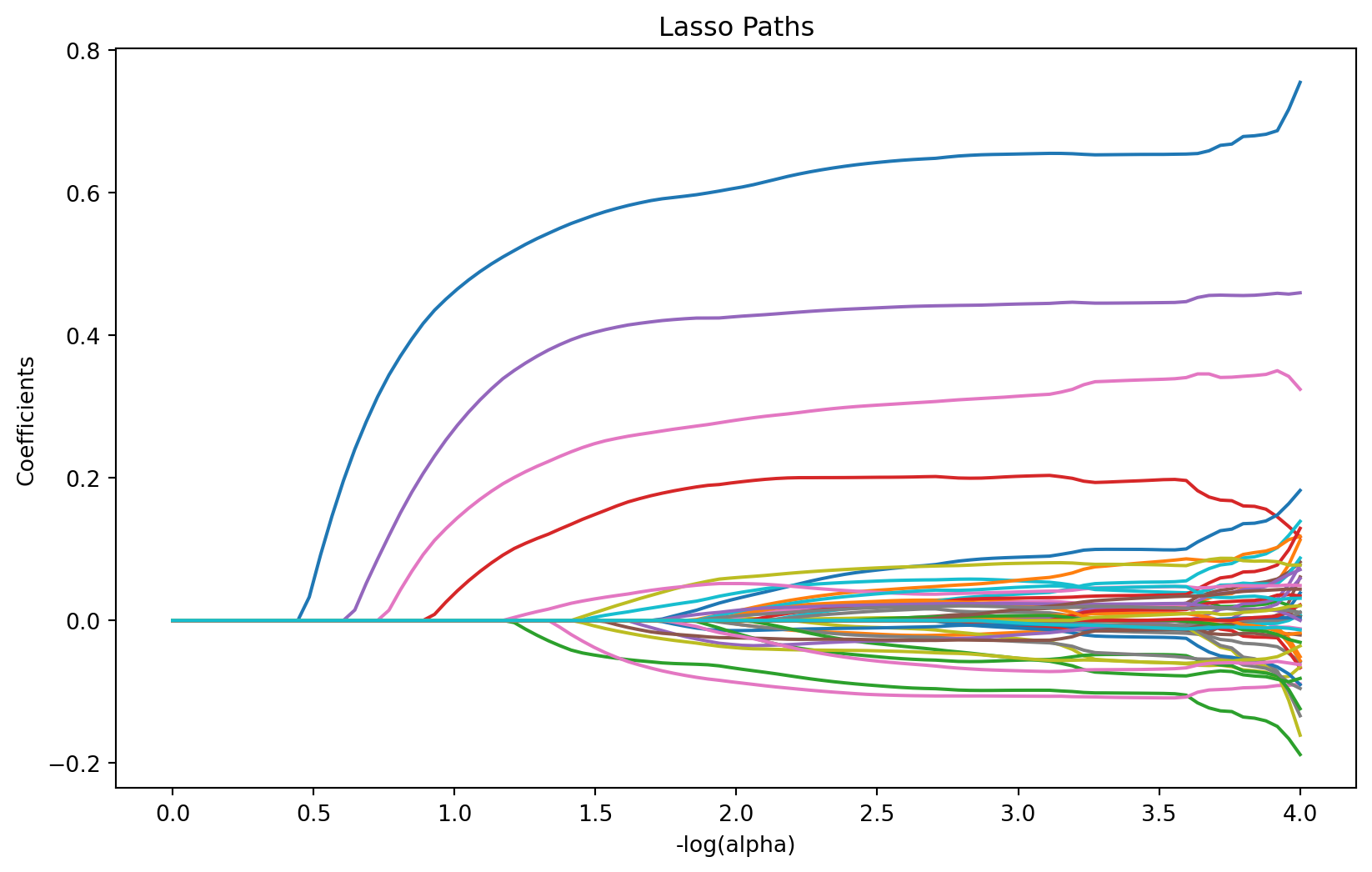 des estimateurs lasso= D25.drop(columns='Y').values X_25 = D25['Y'].values y_25 # Ajuster le modèle Lasso et obtenir le chemin de régularisation = lasso_path(X_25, y_25, alphas=np.logspace(-4, 0, 100)) alphas, coefs, _ # Tracer le chemin de régularisation =(10, 6)) plt.figure(figsize# Tracer les coefficients pour chaque alpha for coef in coefs: -np.log10(alphas), coef) plt.plot( '-log(alpha)') plt.xlabel('Coefficients') plt.ylabel('Lasso Paths') plt.title('tight') plt.axis( plt.show()