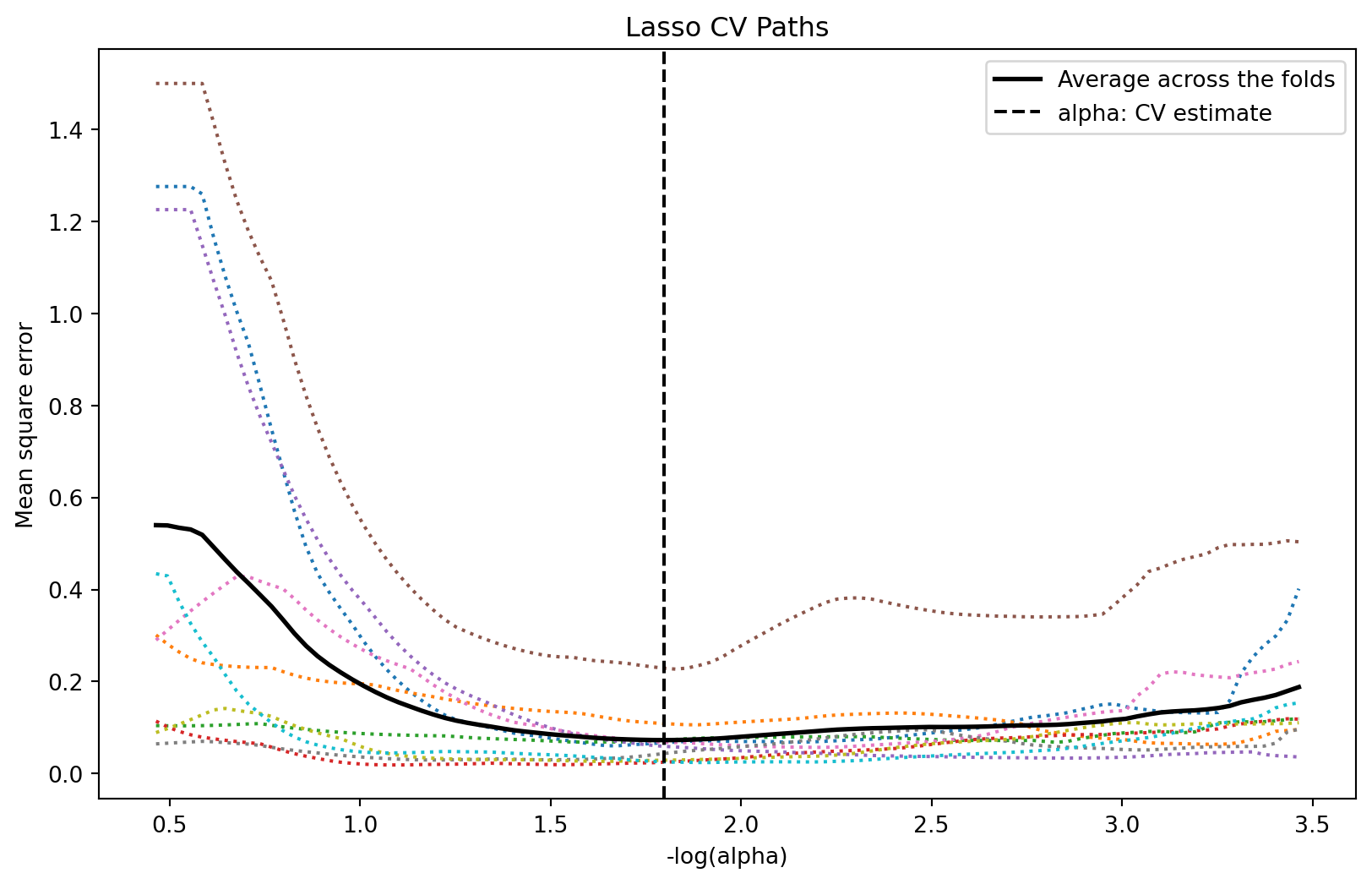 = LassoCV(cv=10, random_state=1234).fit(X_25, y_25) lasso_cv # Tracer les résultats de la validation croisée = -np.log10(lasso_cv.alphas_) m_log_alphas =(10, 6)) plt.figure(figsize':') plt.plot(m_log_alphas, lasso_cv.mse_path_, =-1), 'k', label='Average across the folds', linewidth=2) plt.plot(m_log_alphas, lasso_cv.mse_path_.mean(axis-np.log10(lasso_cv.alpha_), linestyle='--', color='k', label='alpha: CV estimate') plt.axvline( '-log(alpha)') plt.xlabel('Mean square error') plt.ylabel('Lasso CV Paths') plt.title( plt.legend()'tight') plt.axis( plt.show()