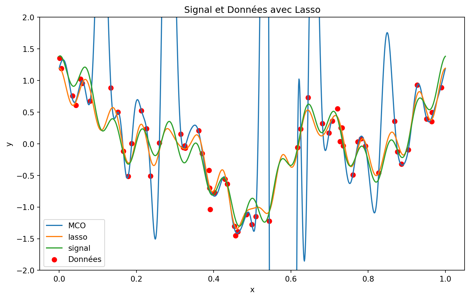 = mat_dict(25, signal['x']) S25 = lasso_cv.predict(S25) prev_lasso 'lasso'] = prev_lasso signal1[= signal1.rename(columns={'y': 'signal'}) signal1 = signal1.melt(id_vars=['x'], value_vars=['signal','MCO' ,'lasso'], var_name='meth', value_name='y') signal2 # Tracer les résultats =(10, 6)) plt.figure(figsizefor key, grp in signal2.groupby('meth'): 'x'], grp['y'], label=key) plt.plot(grp['X'], donnees['Y'], color='red', label='Données') plt.scatter(donnees[-2, 2) # Fixer les limites de l'axe des ordonnées plt.ylim('x') plt.xlabel('y') plt.ylabel( plt.legend()'Signal et Données avec Lasso') plt.title( plt.show()